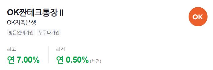 | 50만 원 이하 | OK저축 짠테크통장Ⅱ | 연 7.0% | 간편결제 등록(카카오페이 외 3종) |